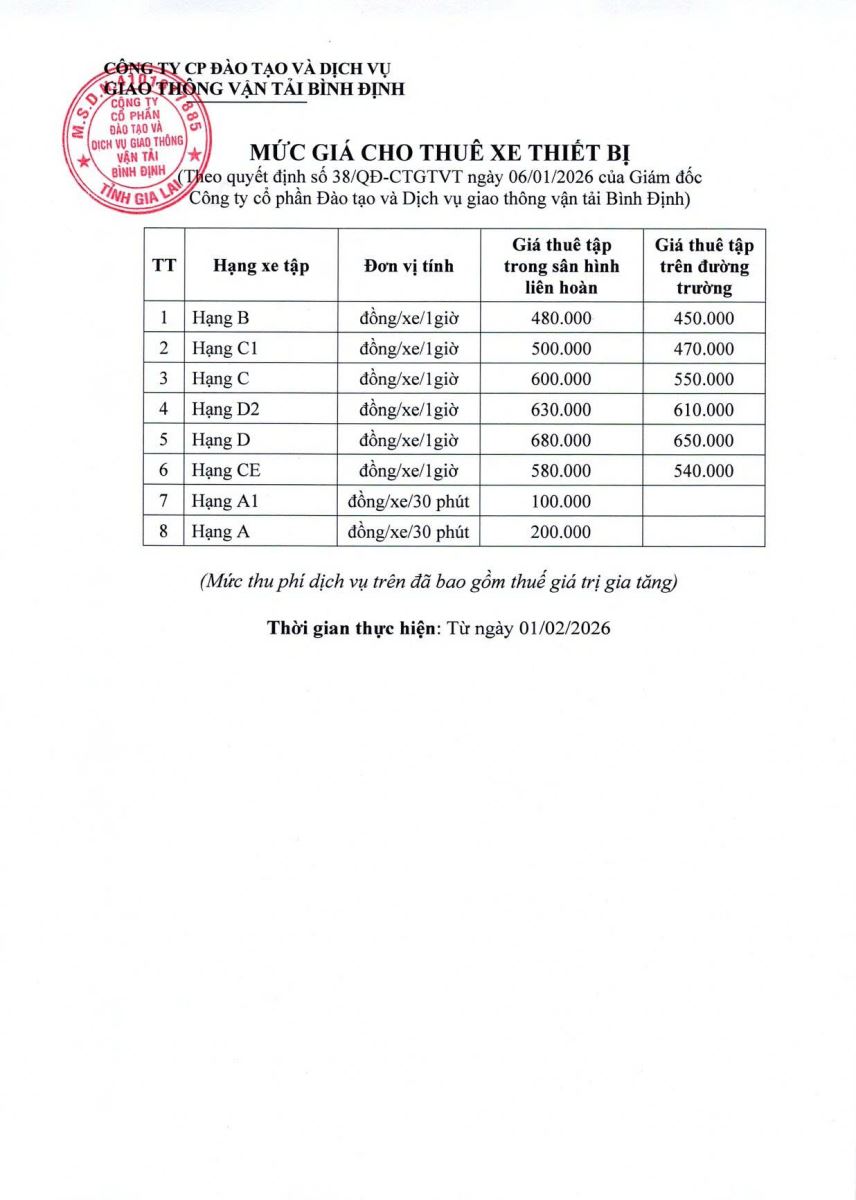 Quyết định số 38/QĐ-CTGTVT ngày 06/01/2026 của Giám đốc Công ty Cổ phần Đào tạo và Dịch vụ giao thông vận tải Bình Định về việc Ban hành mức giá cho thuê xe thiết bị các hạng