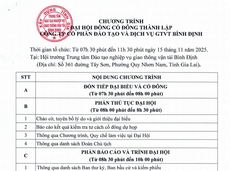 Chương trình Đại hội đồng côt đông thành lập Công ty Cổ phần Đào tạo và Dịch vụ Giao thông vận tải Bình Định (19/10/2025)