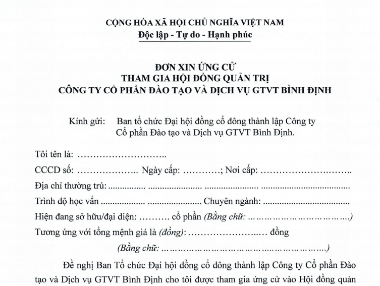 Mẫu đơn xin ứng cử tham gia Hội đồng quản trị Công ty cổ phần Đào tạo và Dịch vụ gtvt Bình Định
