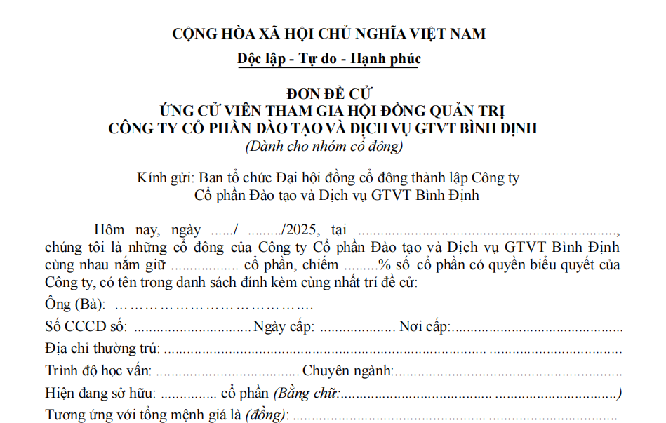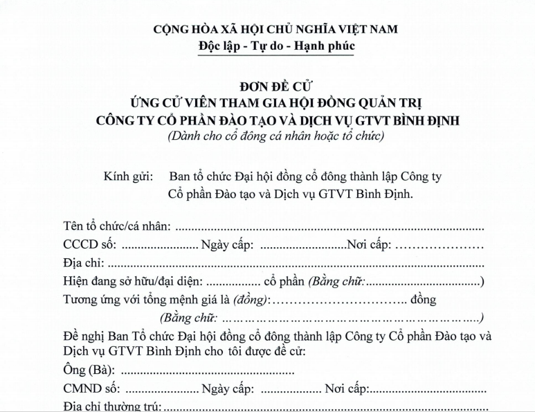 Đơn đề cử ứng cử viên tham gia Hội đồng quản trị Công ty cổ phần Đào tạo và Dịch vụ giao thông vận tải Bình Định (19/10/2025)