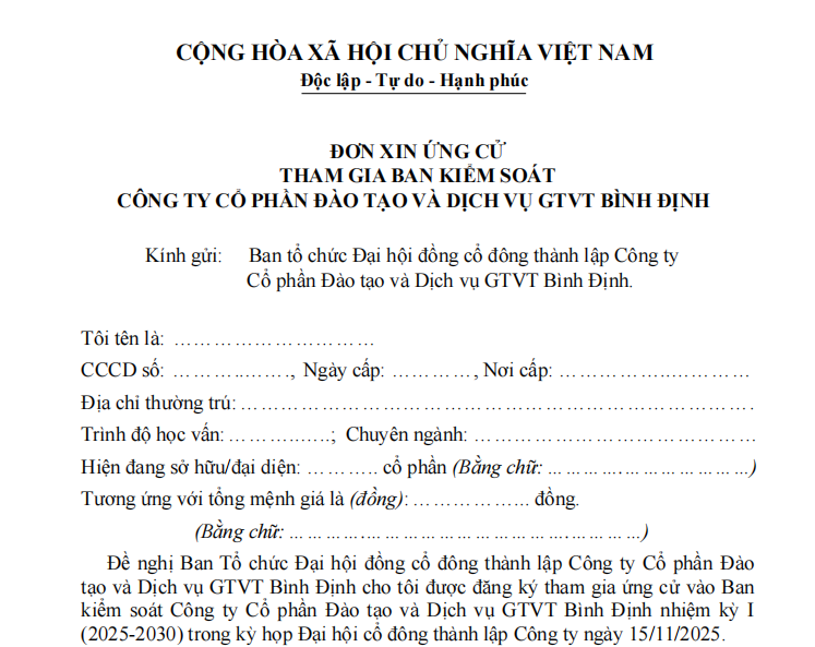 Đơn xin ứng cử tham gia Ban kiểm soát Công ty Cổ phần Đào tạo và Dịch vụ giao thông vận tải Bình Định (19/10/2025)