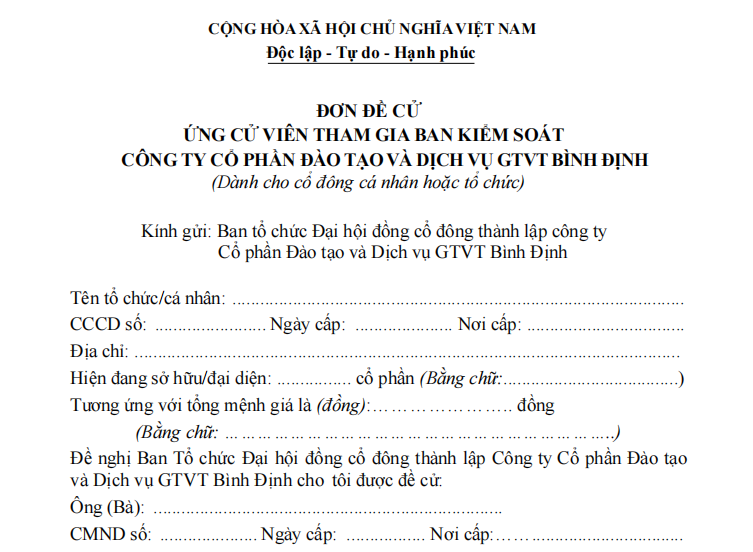 Mẫu đơn xin ứng cử tham gia Ban kiểm soát Công ty Cổ phần Đào tạo và Dịch vụ giao thông vận tải Bình Định