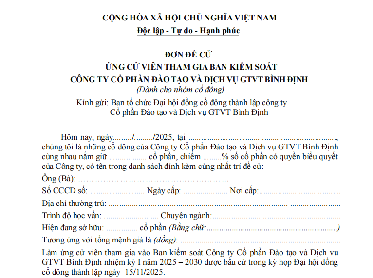 Đơn đề cử ứng cử viên tham gia Ban kiểm soát Công ty Cổ phần Đào tạo và Dịch vụ giao thông vận tải Bình Định (19/10/2025)