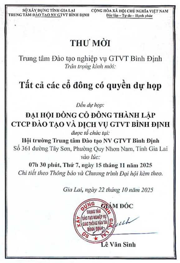 Thư mời tất cả các cổ đông dự họp Đại hội đồng cổ đông thành lập công ty cổ phần Đào tạo và Dịch vụ giao thông vận tải Bình Định (22/10/2025)